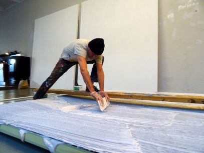 Die Kammspachtel ist Gasteigers Werkzeug. Sie ersetzt den Pinsel und ermöglicht ohne persönliche Handschrift im Sinne eines mechanischen Prozesses zu arbeiten.